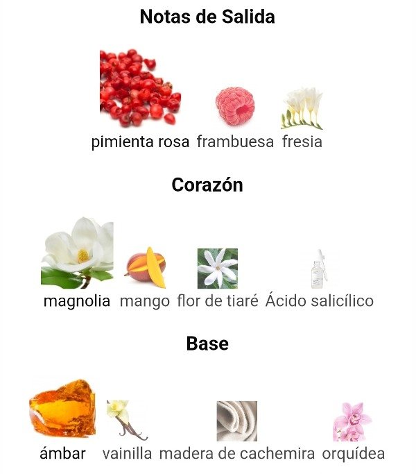 Las Notas de Corazón son magnolia, mango, flor de tiaré y Ácido salicílico.