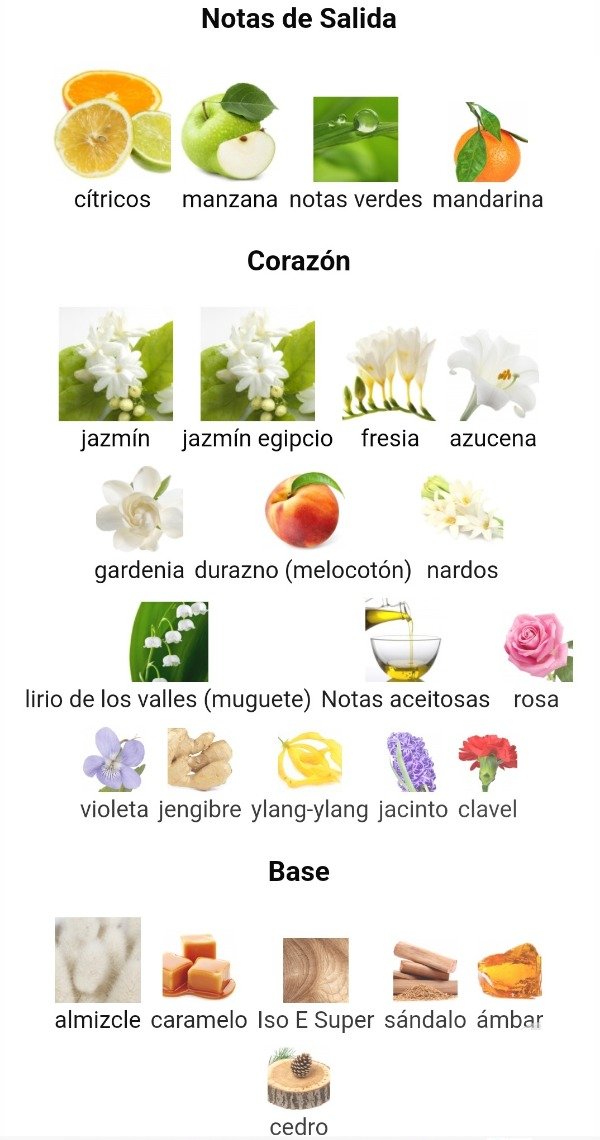 Las Notas de Corazón son jazmín, jazmín egipcio, fresia, azucena, gardenia, durazno (melocotón), nardos, lirio de los valles (muguete), Notas aceitosas, rosa, violeta, jengibre, ylang-ylang, jacinto y clavel.