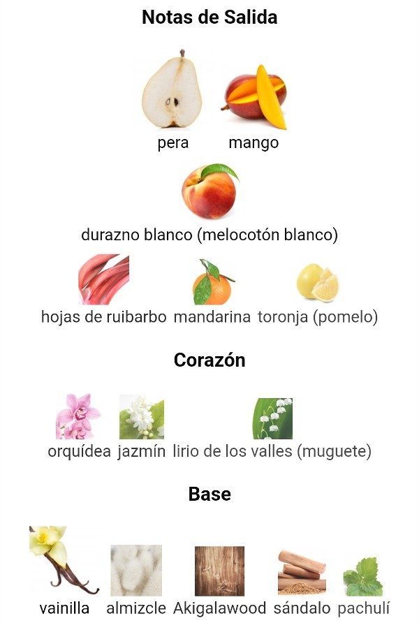 Las Notas de Salida son pera, mango, durazno blanco (melocotón blanco), hojas de ruibarbo, mandarina y toronja (pomelo).