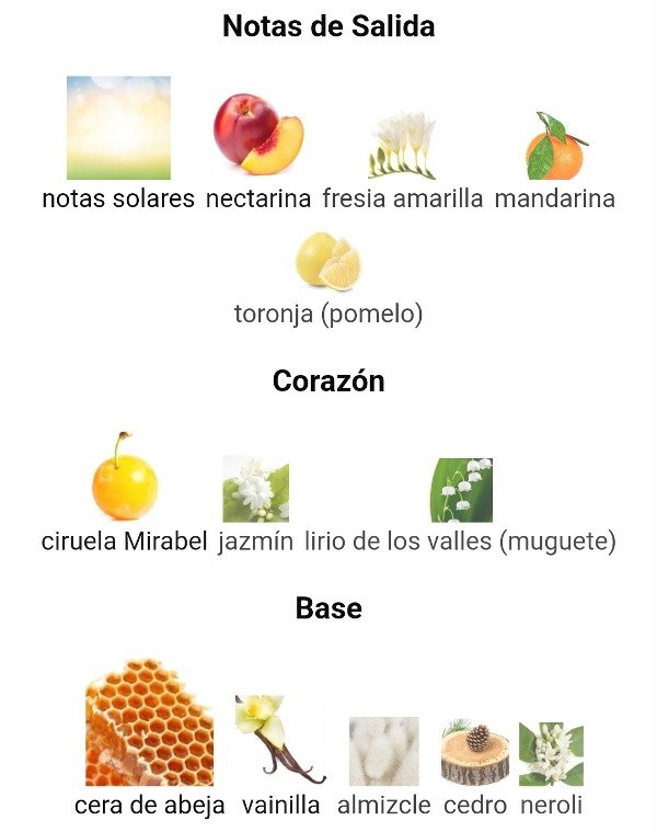 Las Notas de Fondo son cera de abeja, vainilla, almizcle, cedro y neroli.