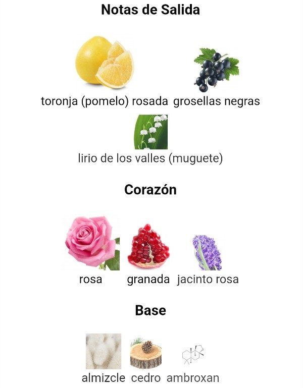 Las Notas de Salida son toronja (pomelo) rosada, grosellas negras y lirio de los valles (muguete).