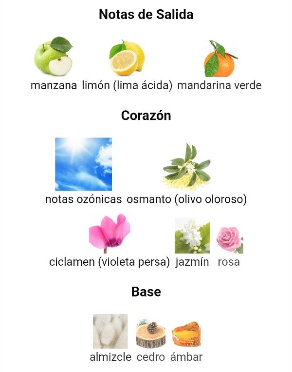 Las Notas de Salida son manzana, limón (lima ácida) y mandarina verde.