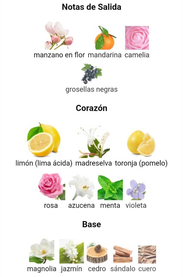 Las Notas de Corazón son limón (lima ácida), madreselva, toronja (pomelo), rosa, azucena, menta y violeta.