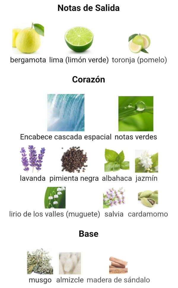 Las Notas de Salida son bergamota, lima (limón verde) y toronja (pomelo).