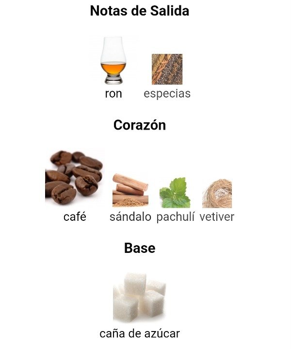 Las Notas de Corazón son café, sándalo, pachulí y vetiver.