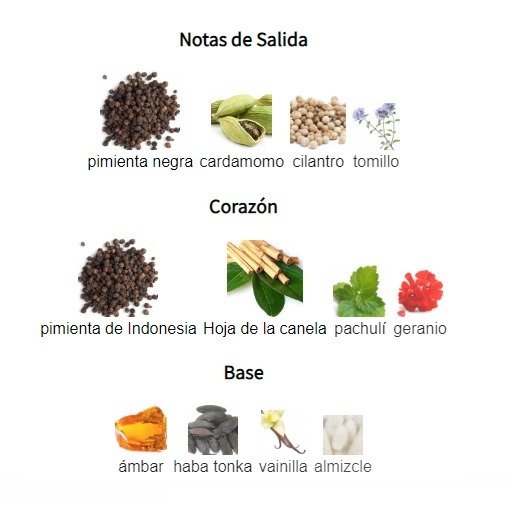 Las Notas de Salida son pimienta negra, cardamomo, cilantro y tomillo.