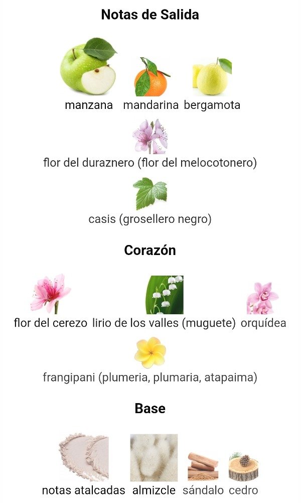 Las Notas de Salida son manzana, bergamota, mandarina, flor del duraznero (flor del melocotonero) y casis (grosellero negro).
