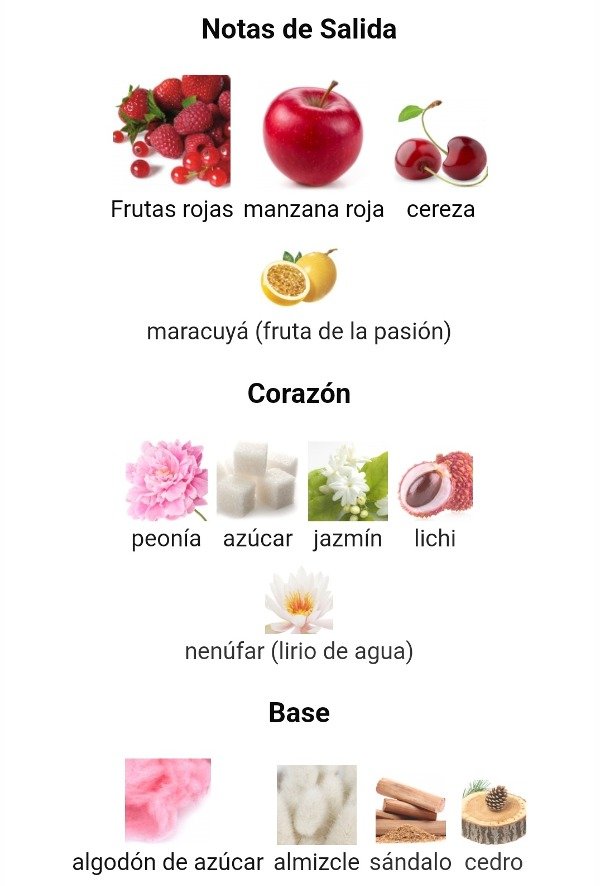 Las Notas de Salida son Frutas rojas, manzana roja, cereza y maracuyá (fruta de la pasión).