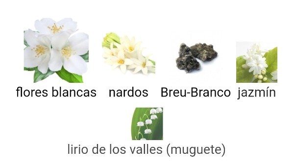 Notas de flores blancas, nardos, Breu-Branco, jazmín, lirios de los valles.