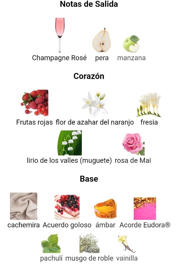 Las Notas de Corazón son Frutas rojas, flor de azahar del naranjo, fresia, lirio de los valles (muguete) y rosa de Mai.