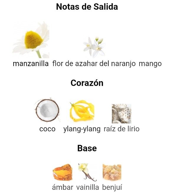 Las Notas de Corazón son coco, ylang-ylang y raíz de lirio.
