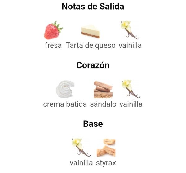 Las Notas de Salida son fresa, Tarta de queso y vainilla.